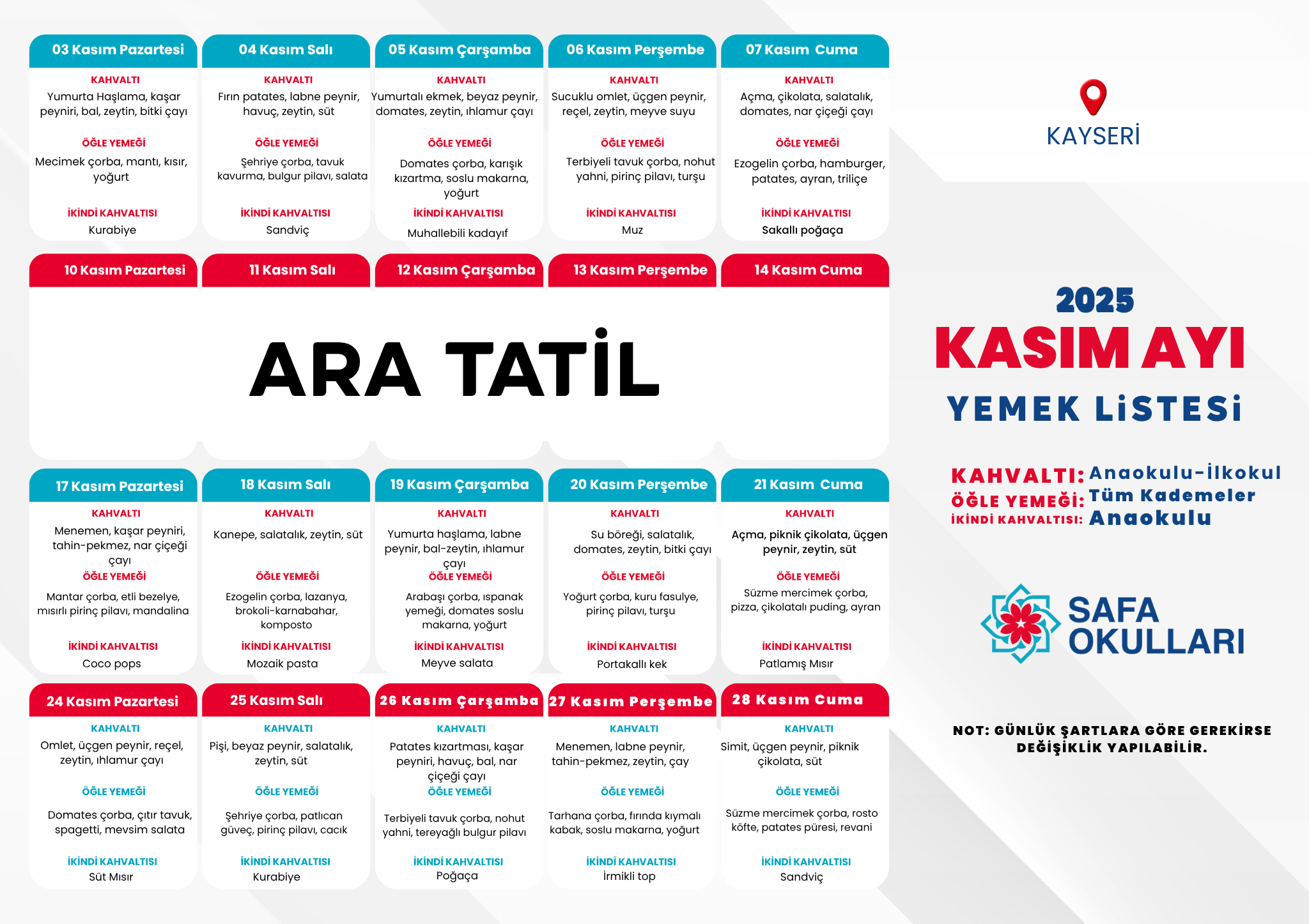 KAYSERİ / KASIM AYI YEMEK MENÜSÜ
